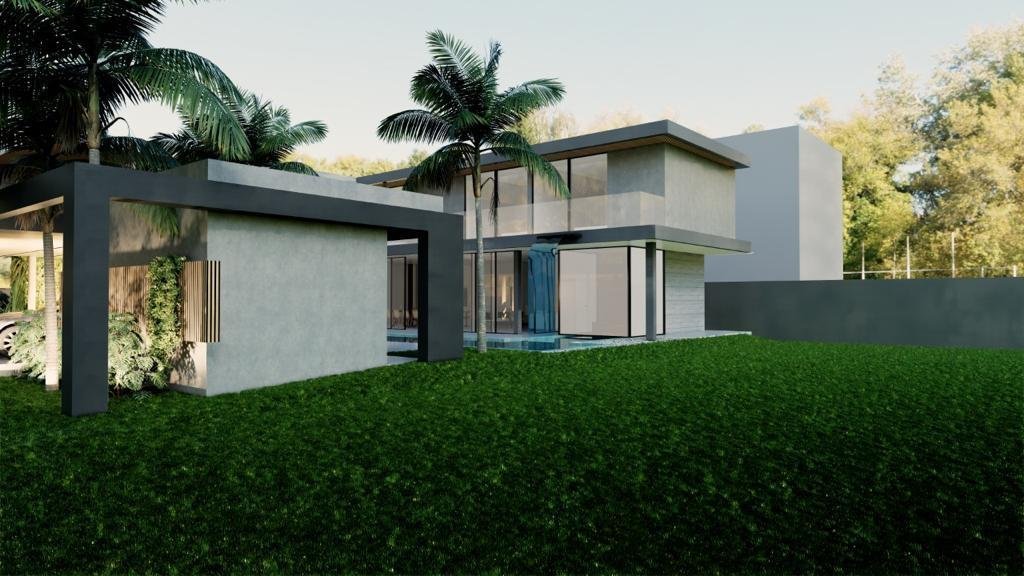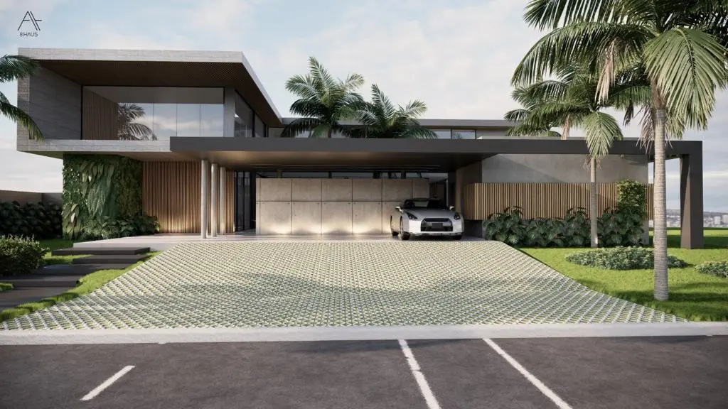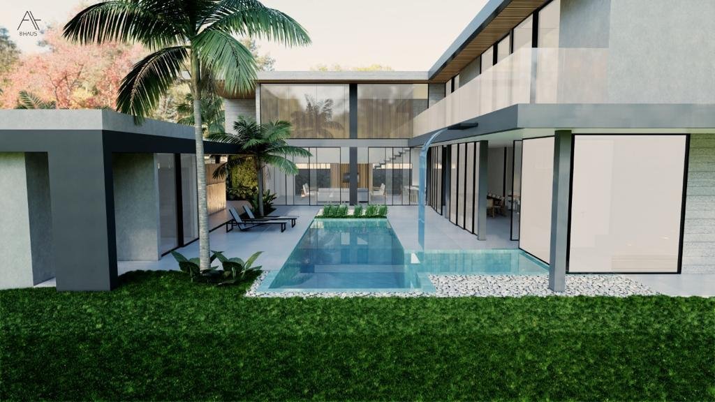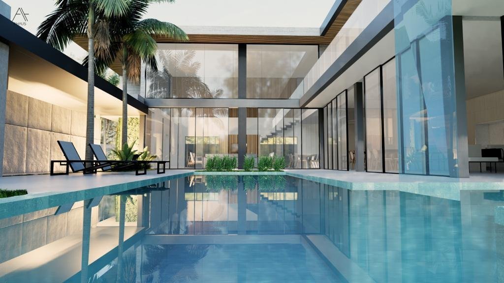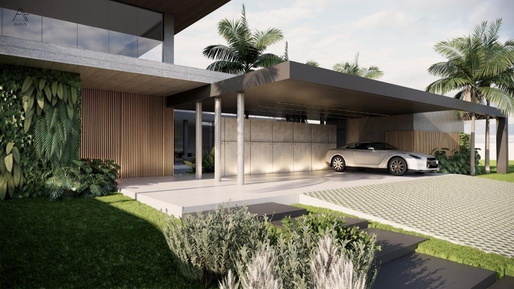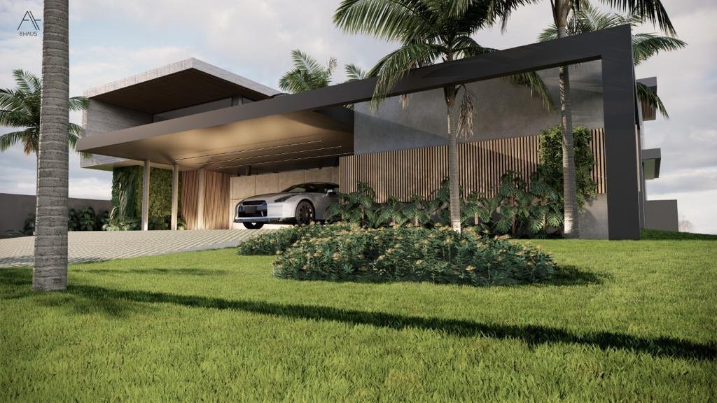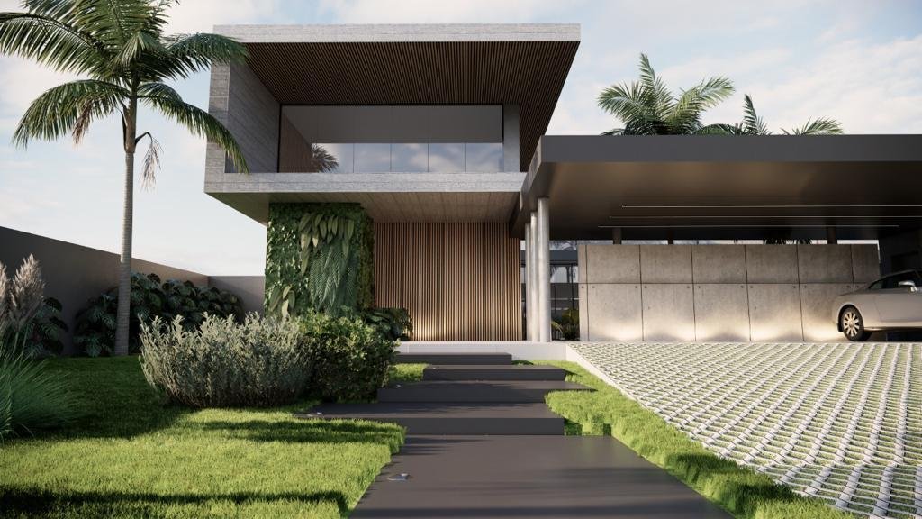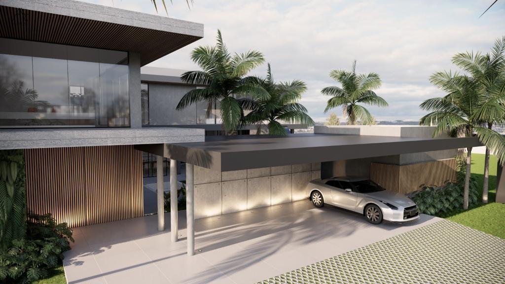 Residência de 659 m² com 5 suítes, piscina com cascata, sauna integrada e hidromassagem. Área gourmet integrada e fire place na sala de estar. Garagem para 8 veículos. Projeto assinado pela arquiteta Gabriela Prudêncio no Condomínio Park Lane.