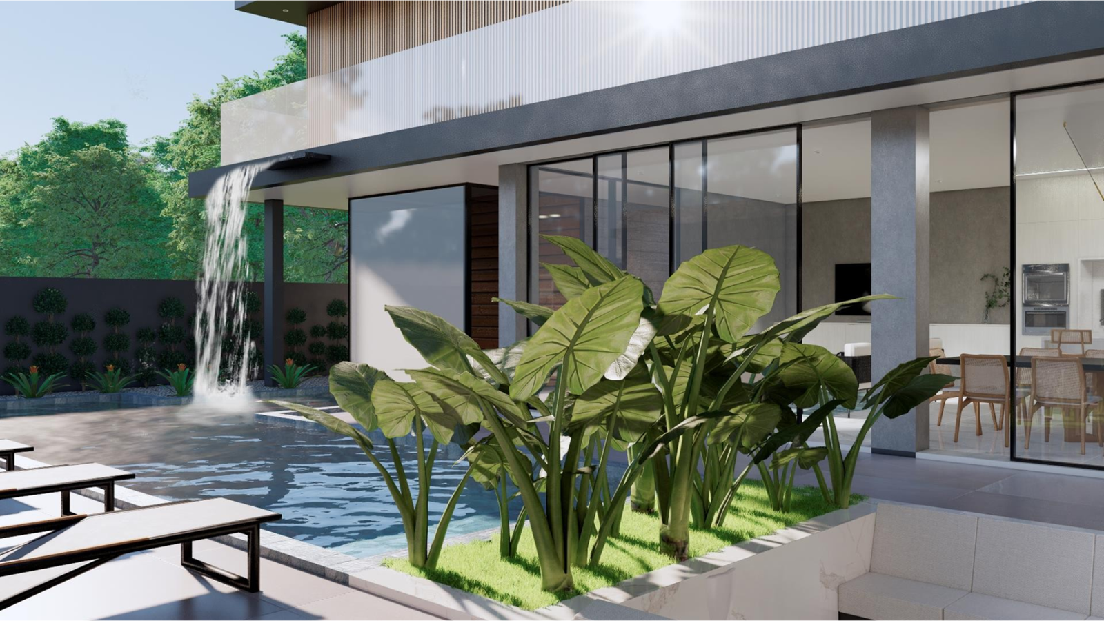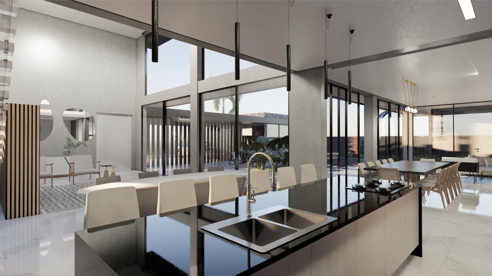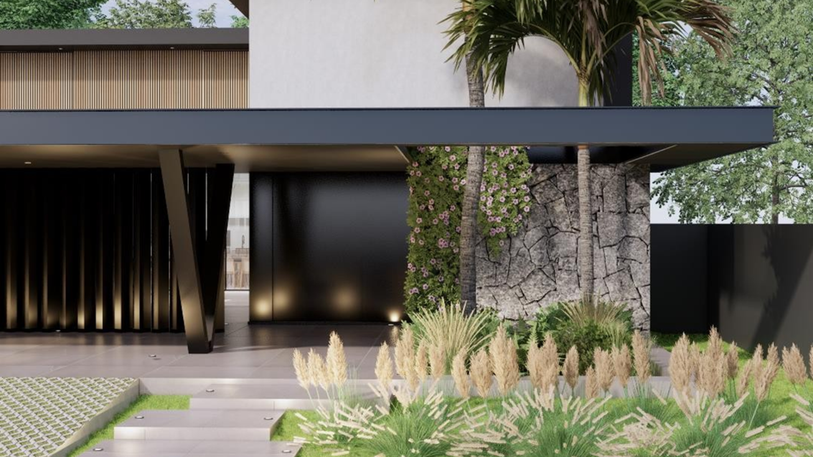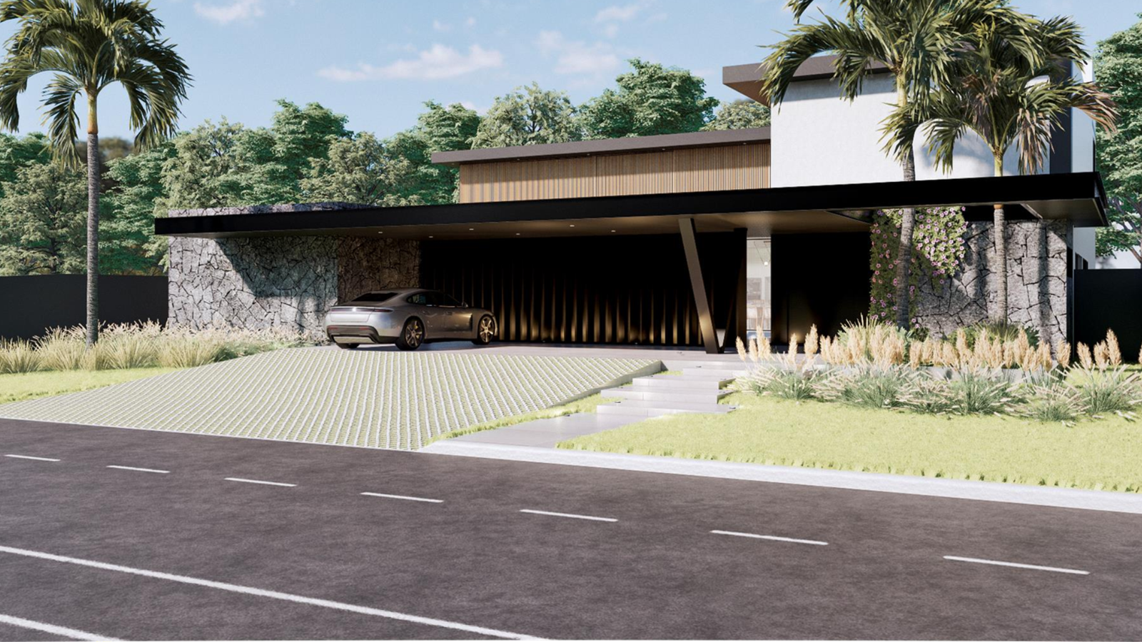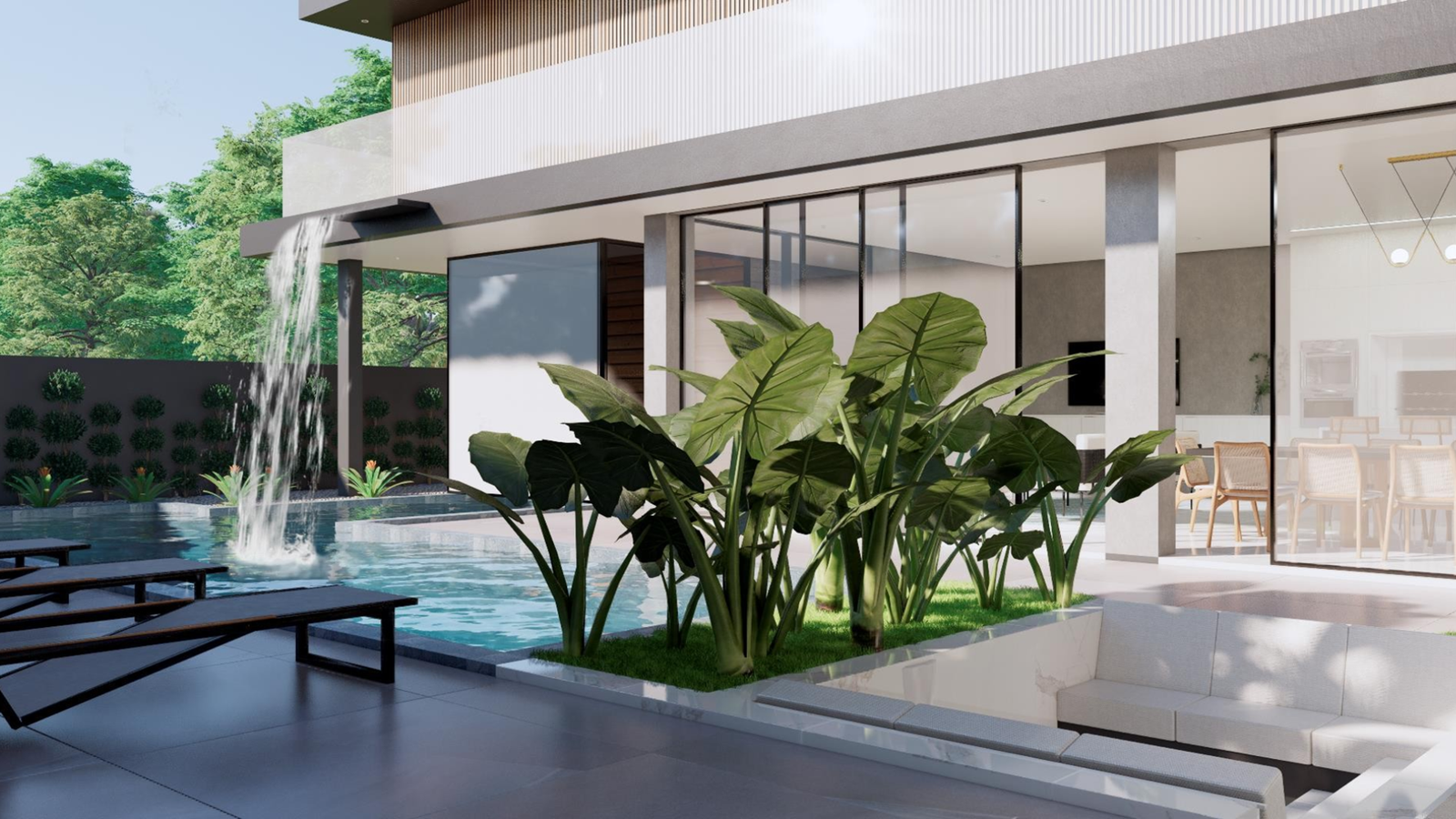 Residência de 610 m² com fachada marcante em formato "U" e integração total entre interior e piscina. 5 suítes, 3 salas integradas, piscina com cascata, sauna, área gourmet e quarto de funcionários. Garagem para 8 veículos. Projeto assinado por Gabriela Prudêncio.