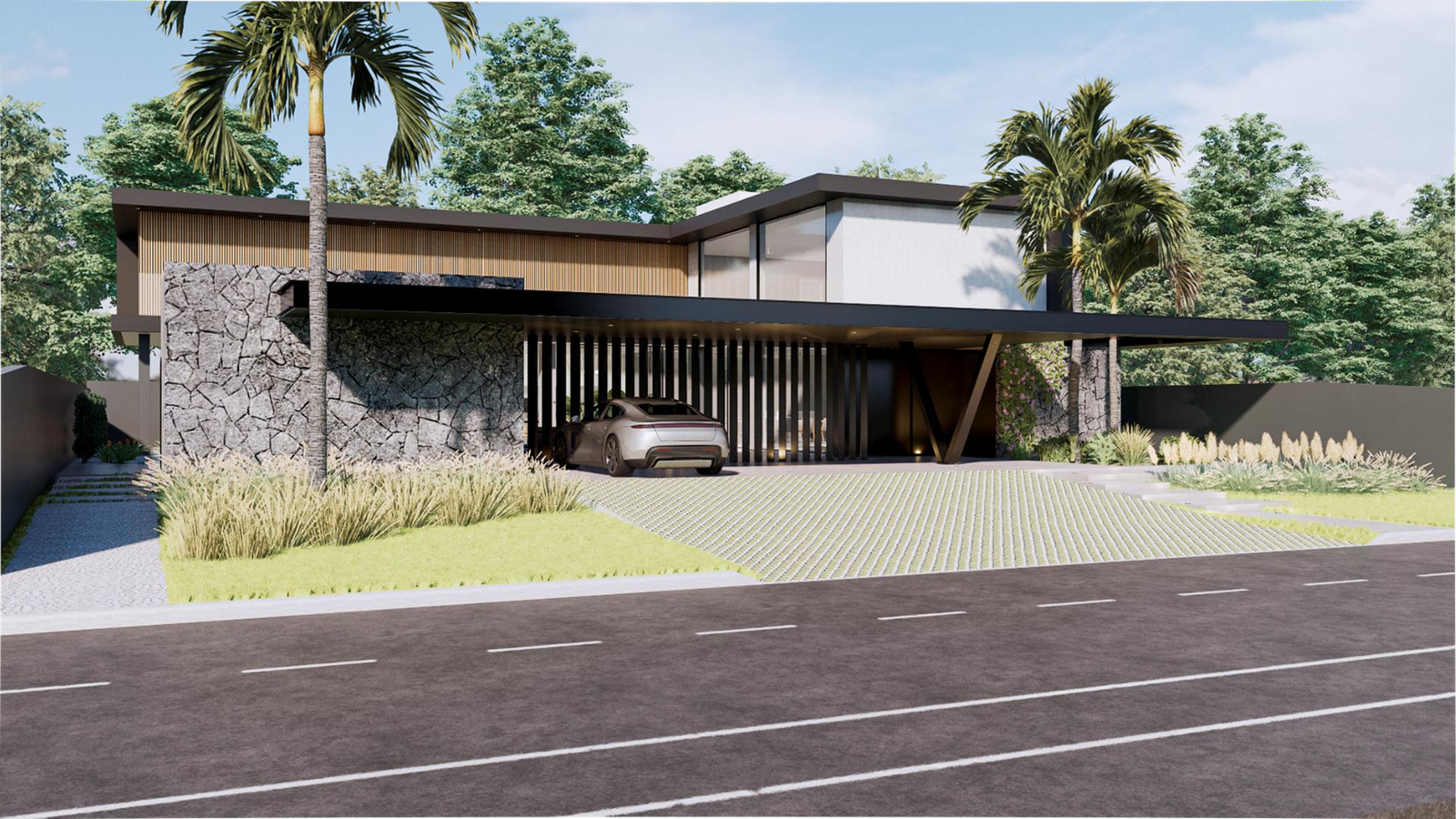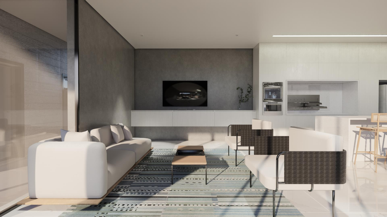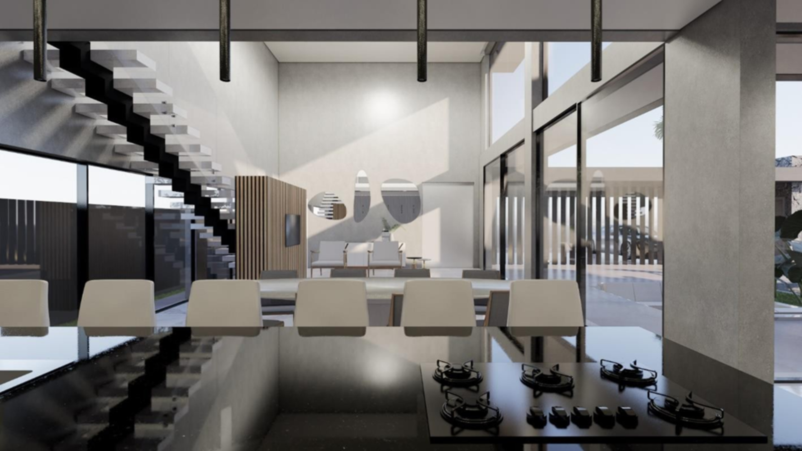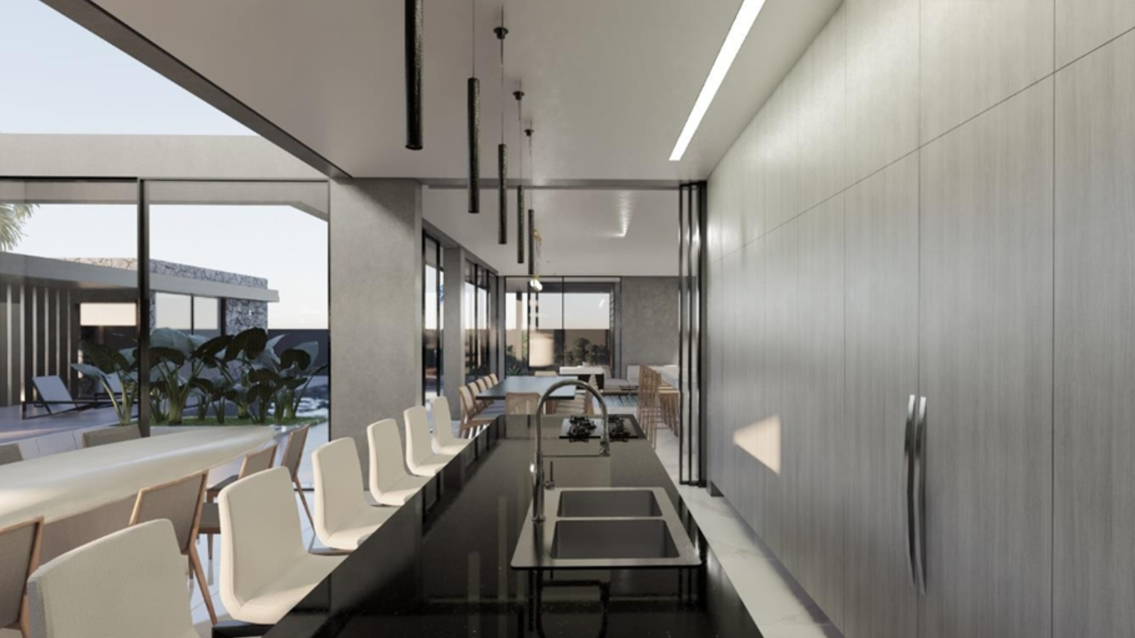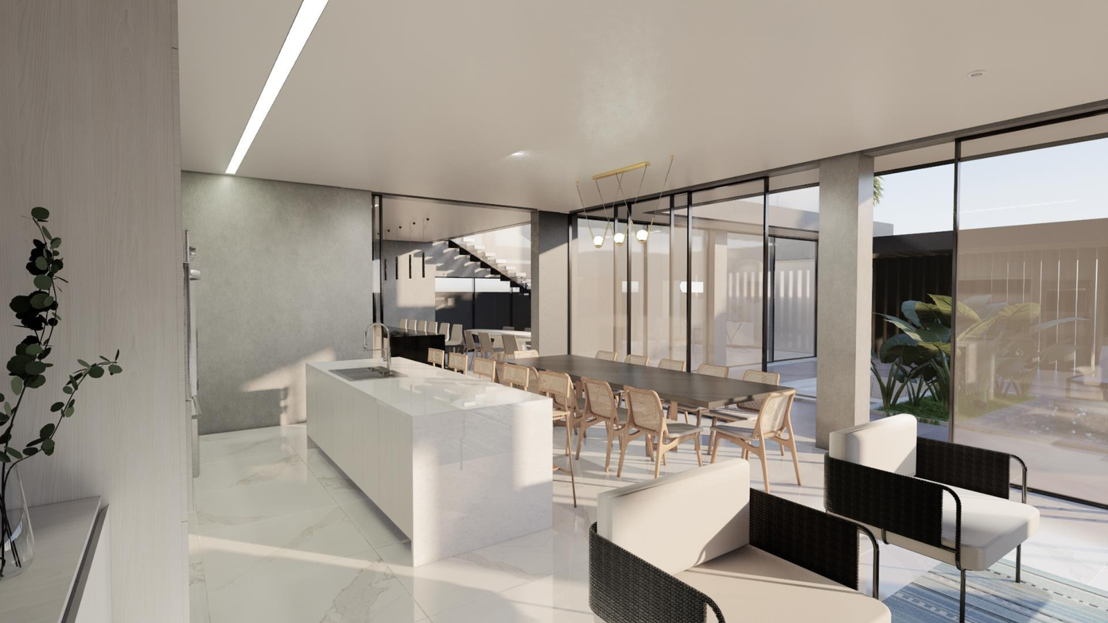 Residência de 610 m² com fachada marcante em formato "U" e integração total entre interior e piscina. 5 suítes, 3 salas integradas, piscina com cascata, sauna, área gourmet e quarto de funcionários. Garagem para 8 veículos. Projeto assinado por Gabriela Prudêncio.