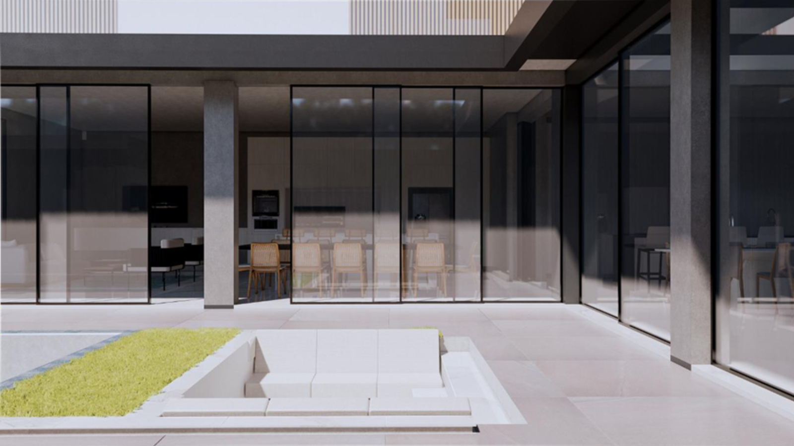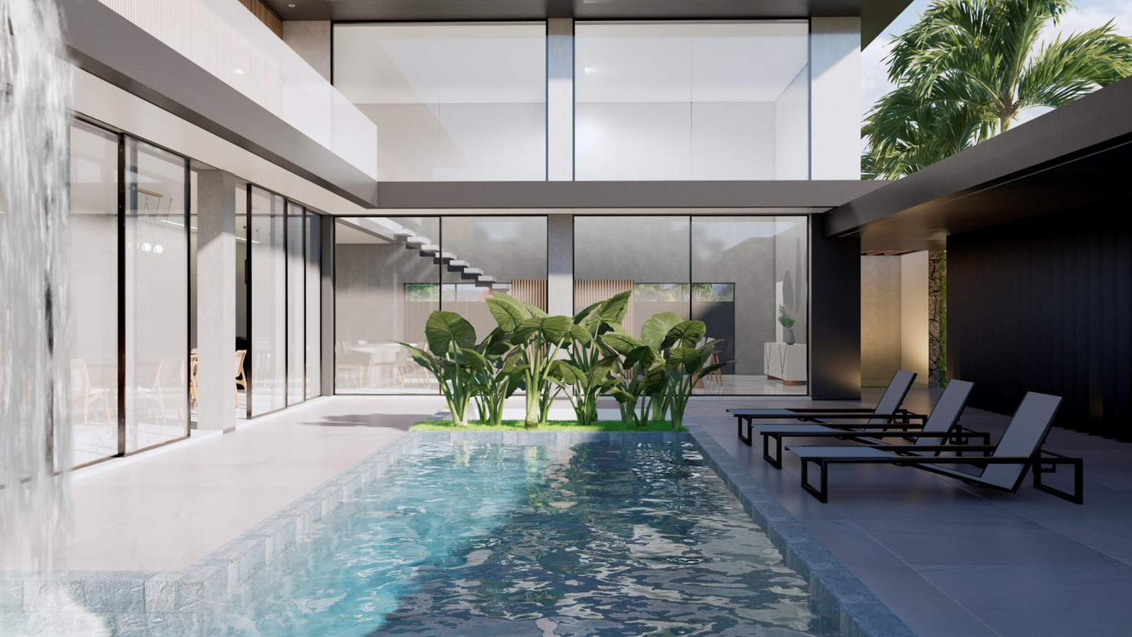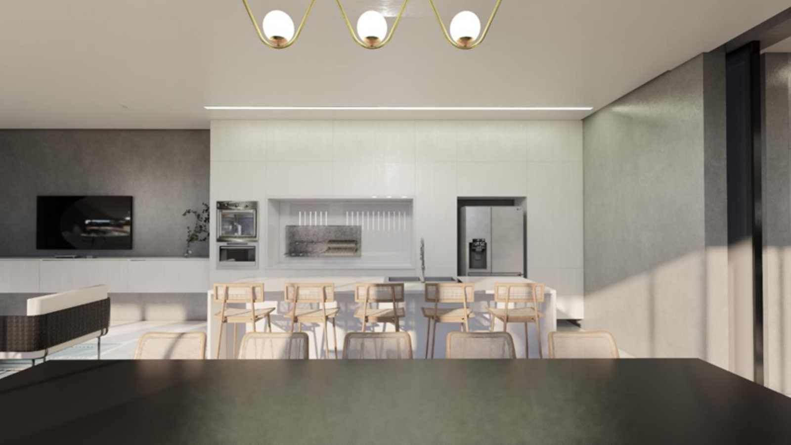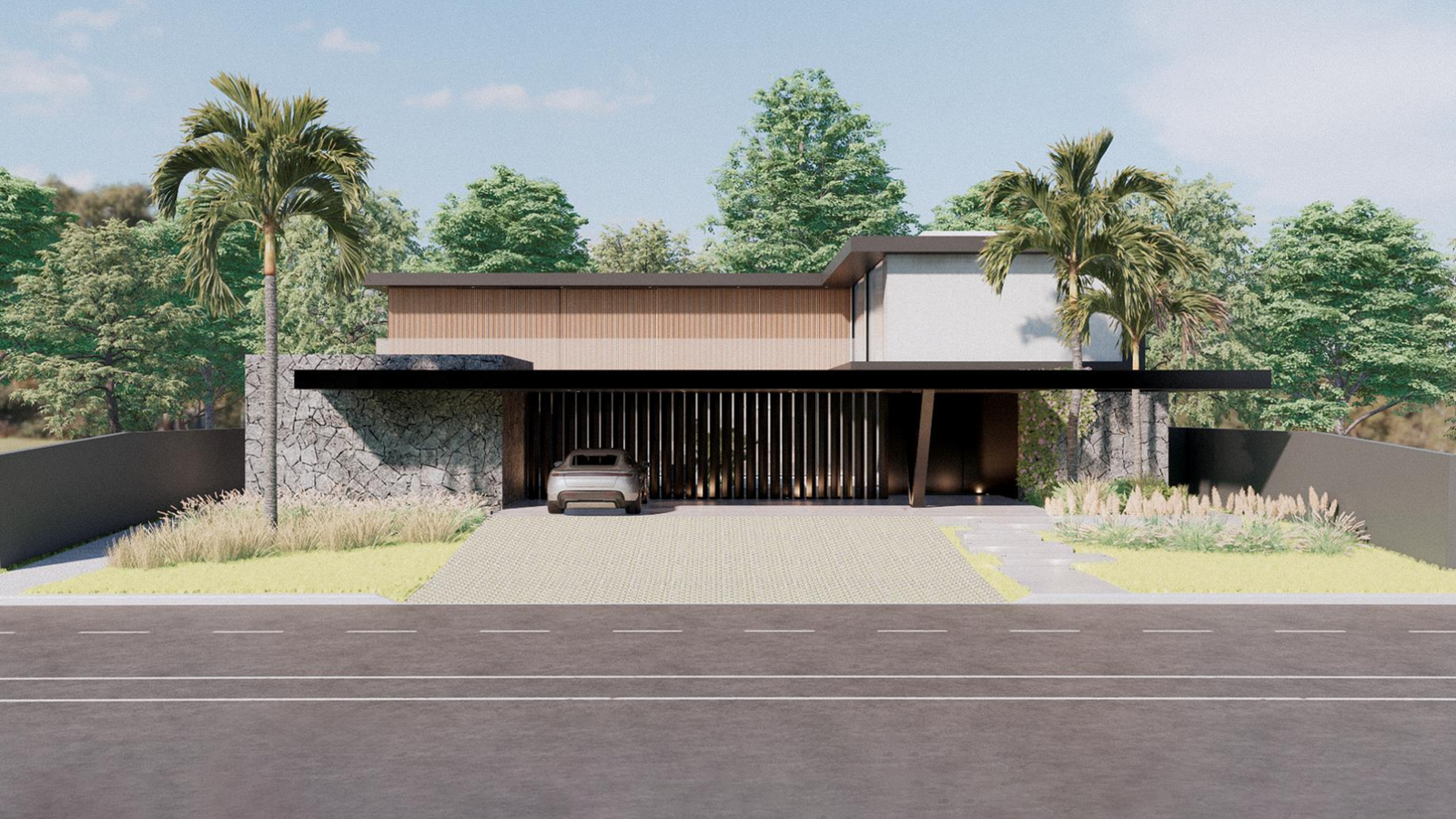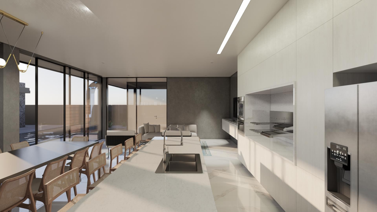 Residência de 610 m² com fachada marcante em formato "U" e integração total entre interior e piscina. 5 suítes, 3 salas integradas, piscina com cascata, sauna, área gourmet e quarto de funcionários. Garagem para 8 veículos. Projeto assinado por Gabriela Prudêncio.