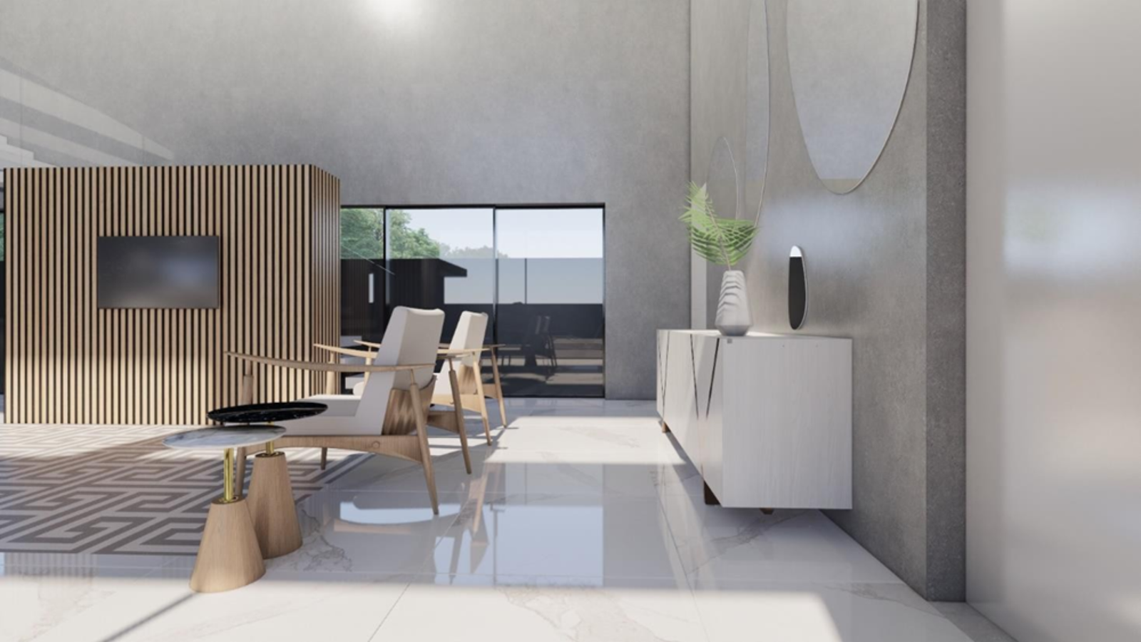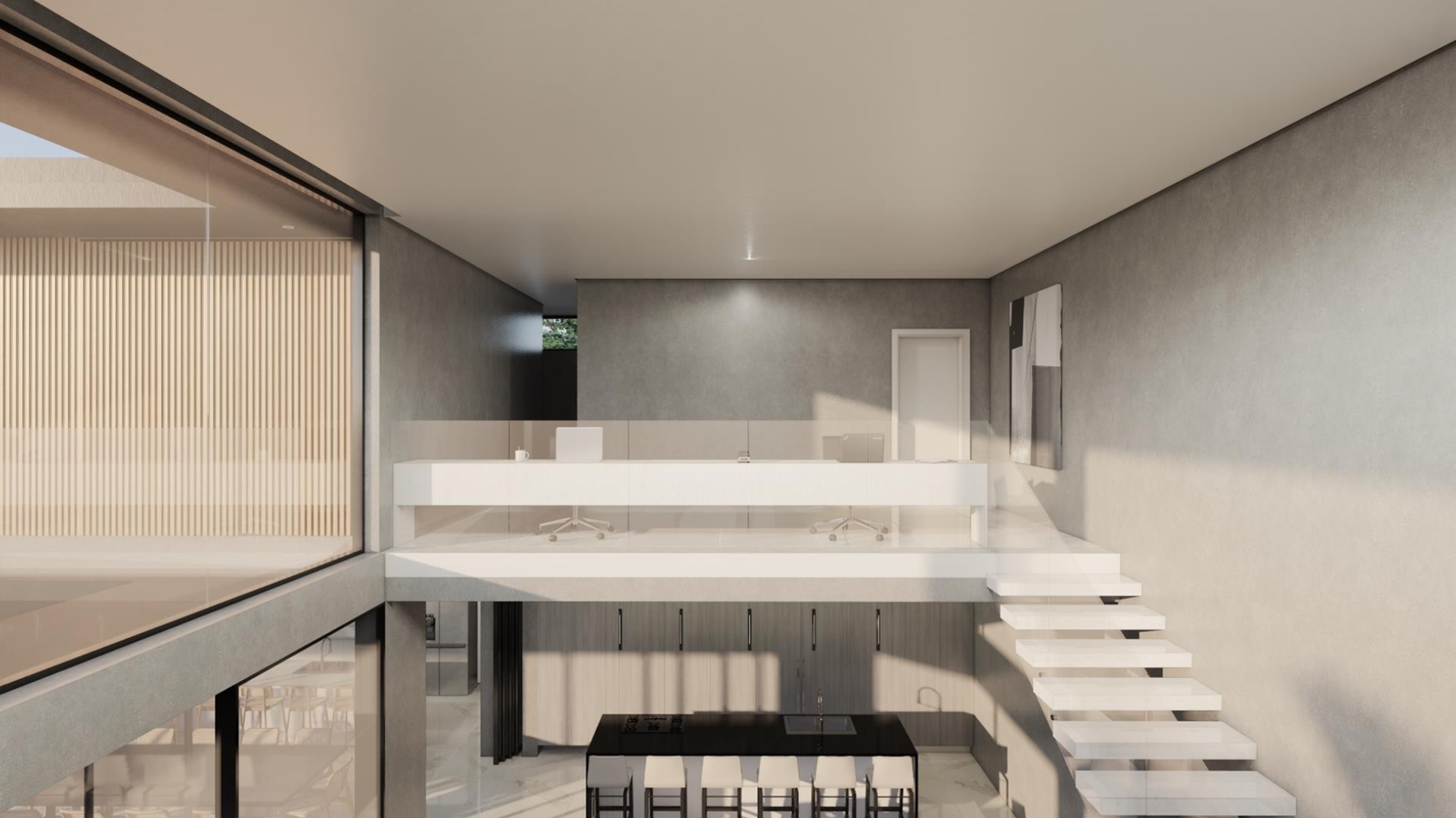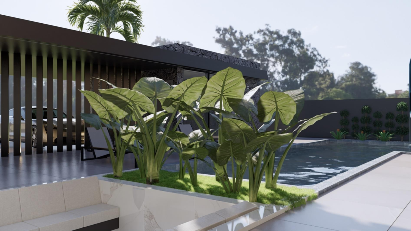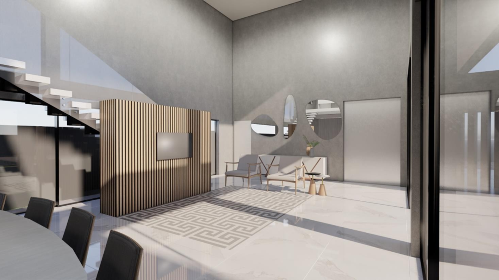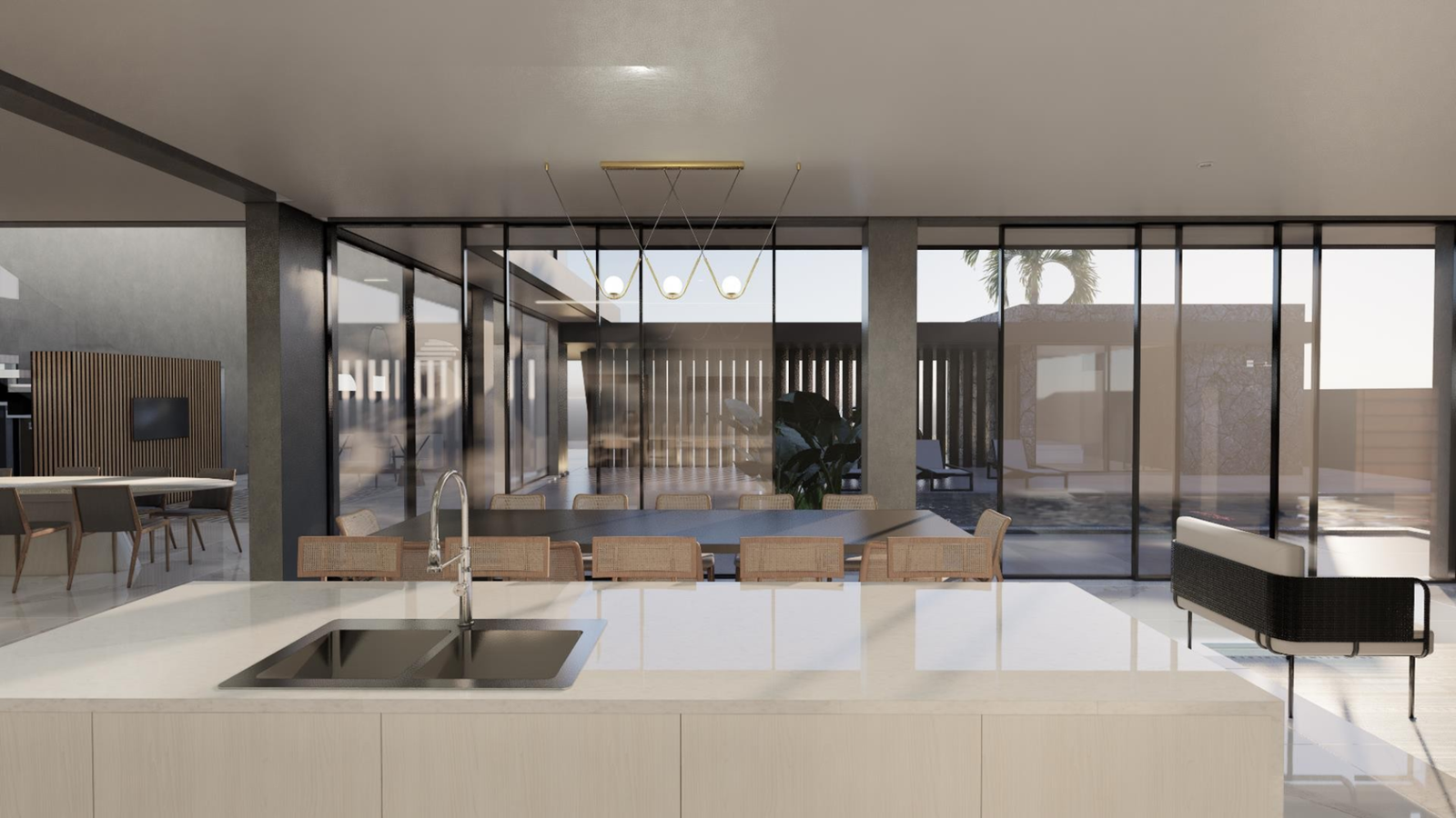 Residência de 610 m² com fachada marcante em formato "U" e integração total entre interior e piscina. 5 suítes, 3 salas integradas, piscina com cascata, sauna, área gourmet e quarto de funcionários. Garagem para 8 veículos. Projeto assinado por Gabriela Prudêncio.